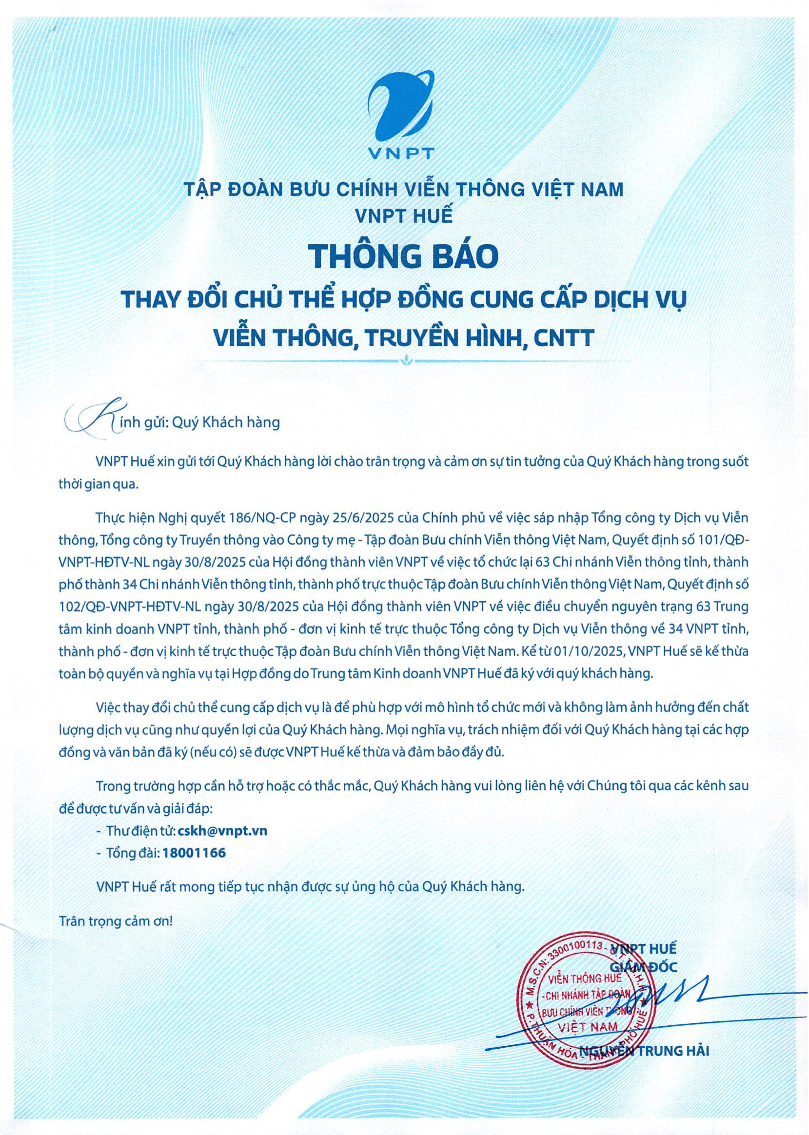 Thông báo thay đổi chủ thể hợp đồng cung cấp dịch vụ viễn thông, truyền hình, công nghệ thông tin (02/10/2025)